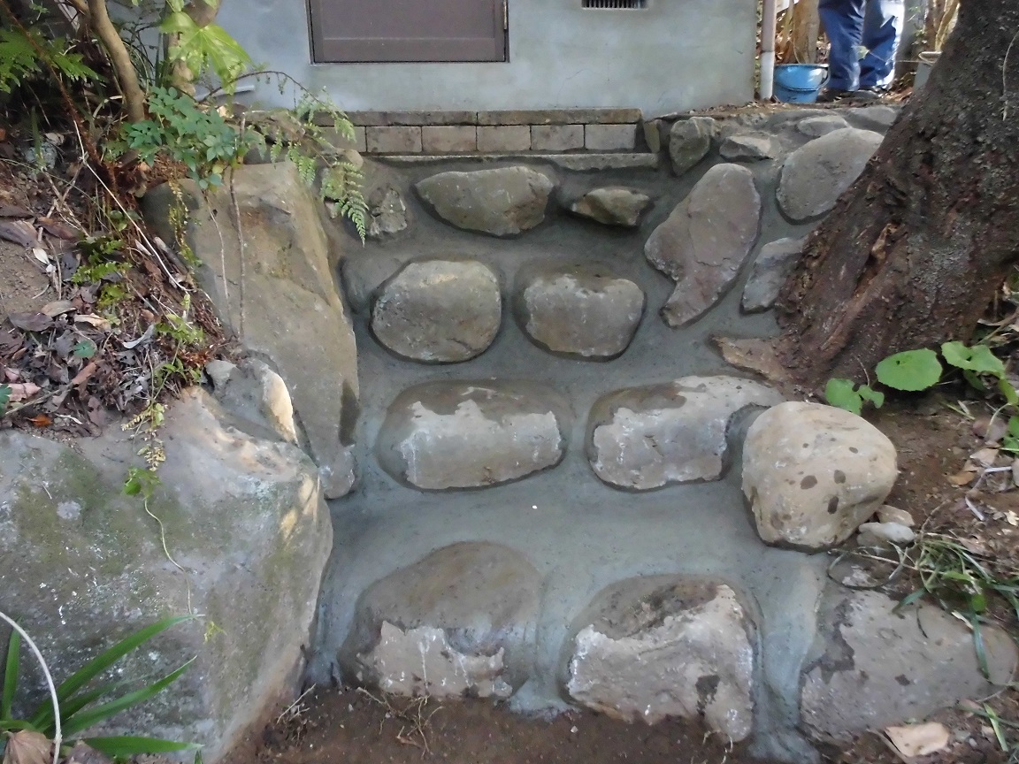 玄関へと上がる数段のステップ脇に、その基礎層の仕事場へと向かう外階段、石段があり、