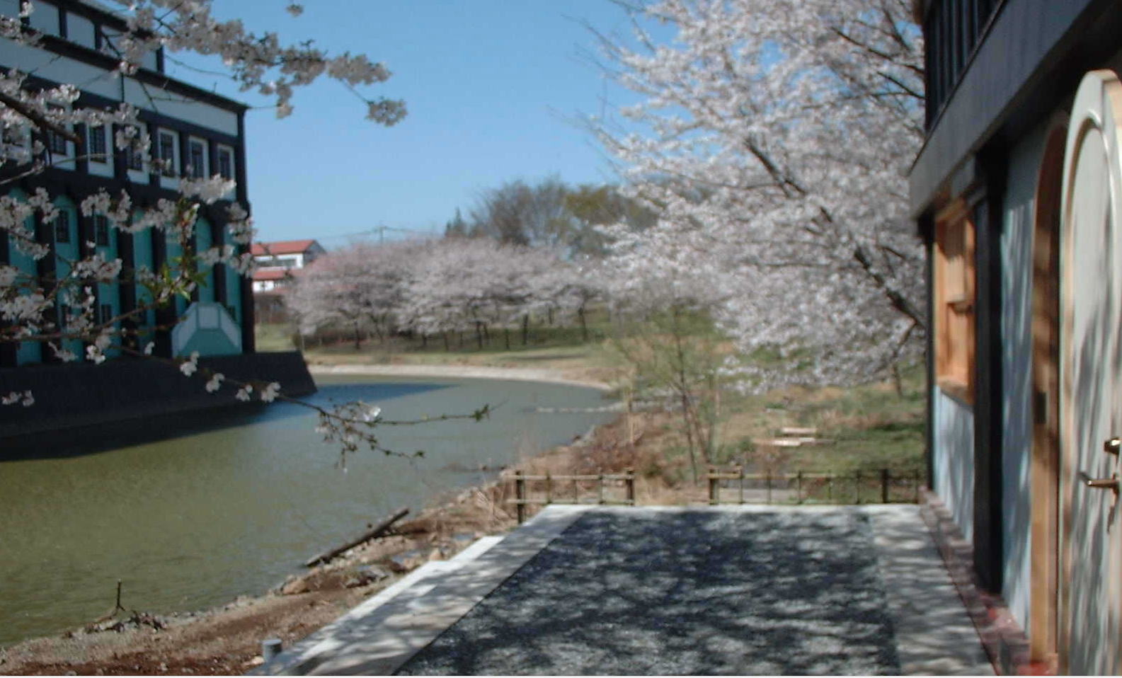 エントランスポーチからの、太鼓橋方向の、桜並木が続くカーブを描く池と大講堂と、