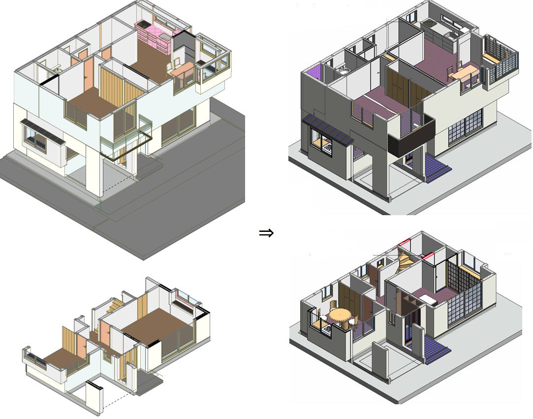 一頃のスタイロフォームの模型のような家、RevitなどBIMでつくられた空間、建築だなと