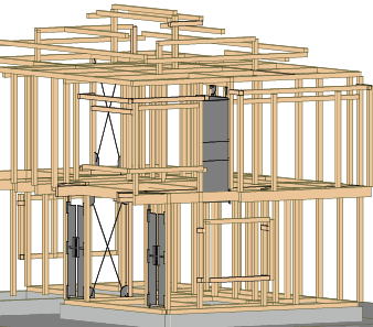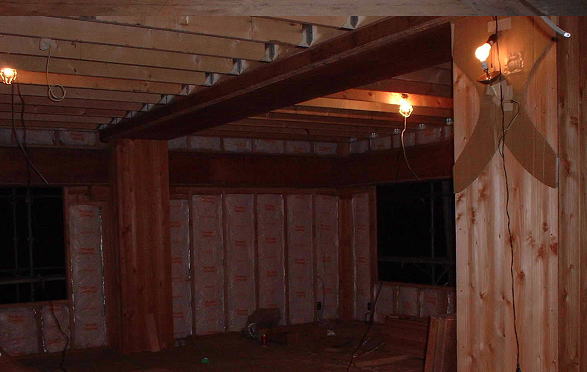 実際の空間に現しとなる、伝統的木造に見えても枠組み工法の、2階床をささえる根太は、